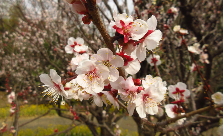 早咲きの八重寒紅(やえかんこう)、玉牡丹(ぎょくぼたん)などに始まり、遅咲きの豊後(ぶんご)、呉服枝垂(くれはしだれ)