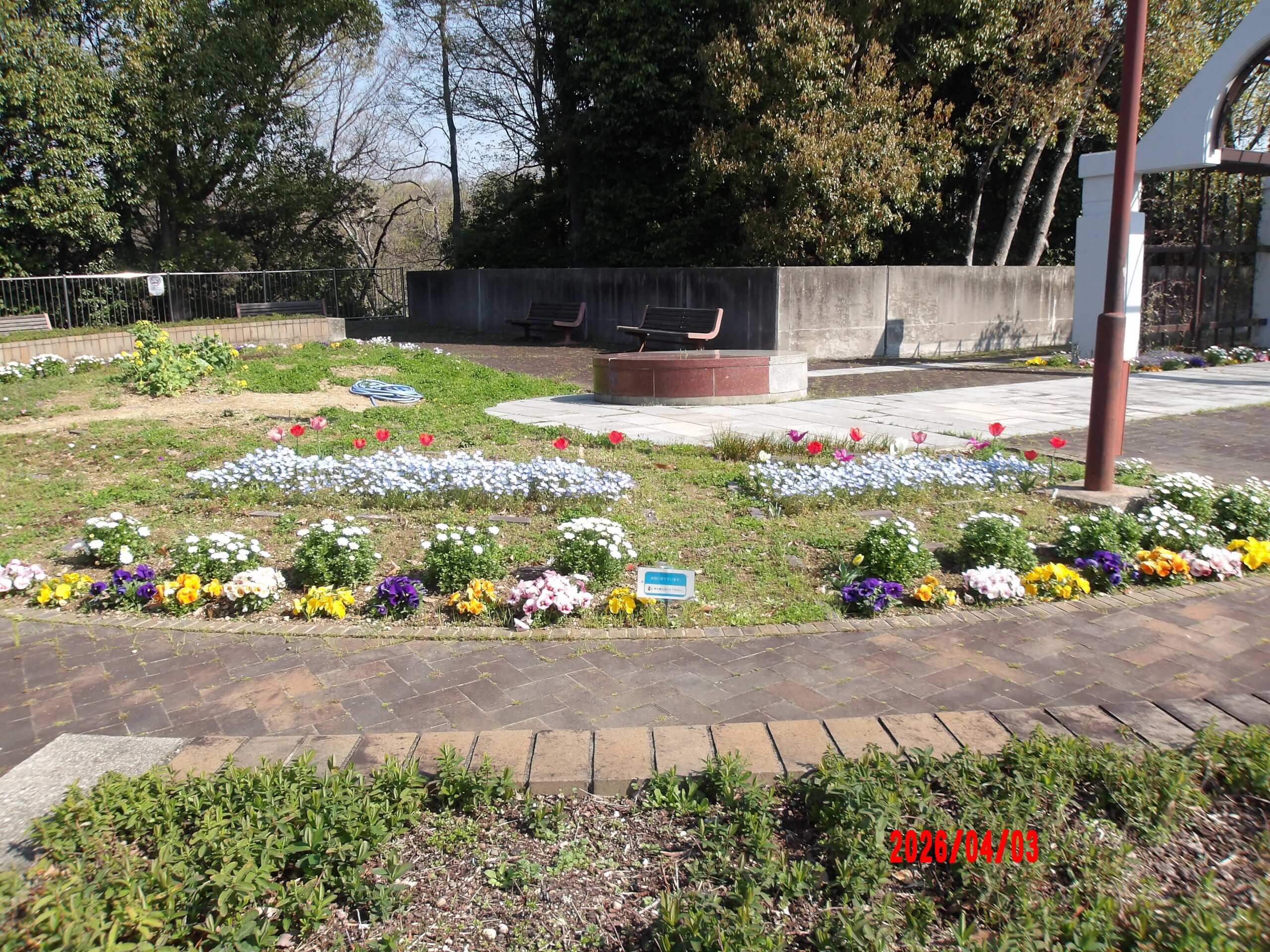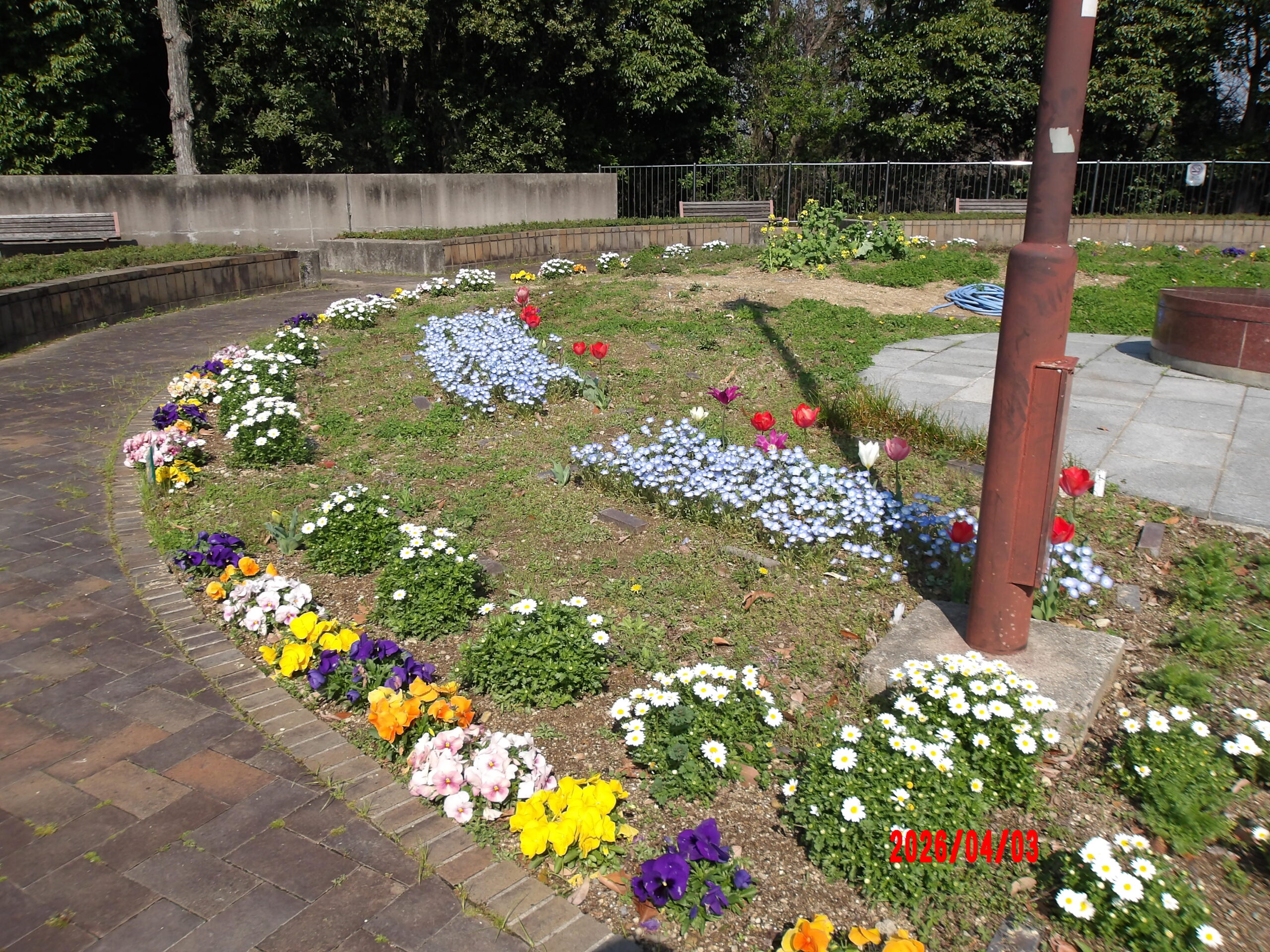 高塚公園前のバス停を降りてすぐの円形花壇の花が見頃です。