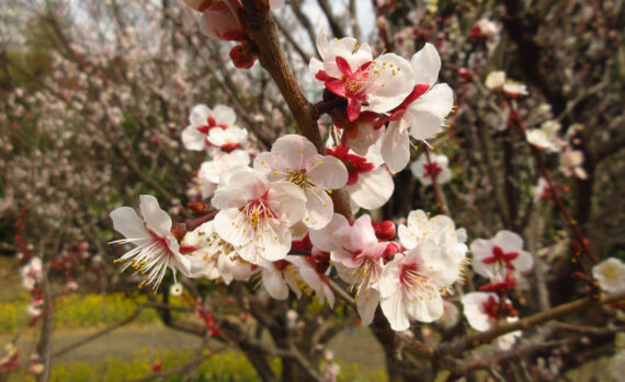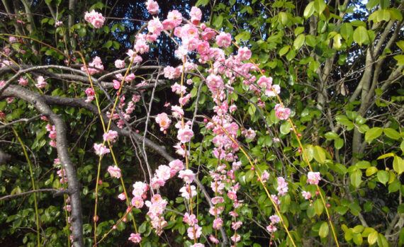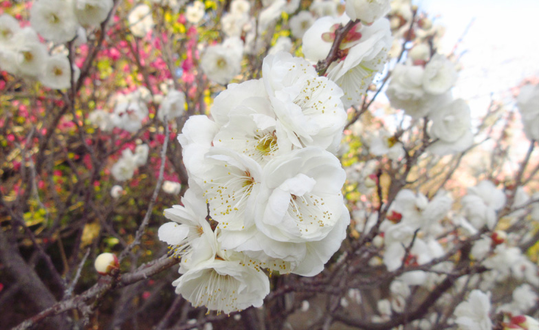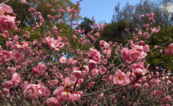 早咲きの八重寒紅(やえかんこう)、玉牡丹(ぎょくぼたん)などに始まり、遅咲きの豊後(ぶんご)、呉服枝垂(くれはしだれ)などが咲き終わるまで、約1か月半に渡り、お楽しみいただけます。