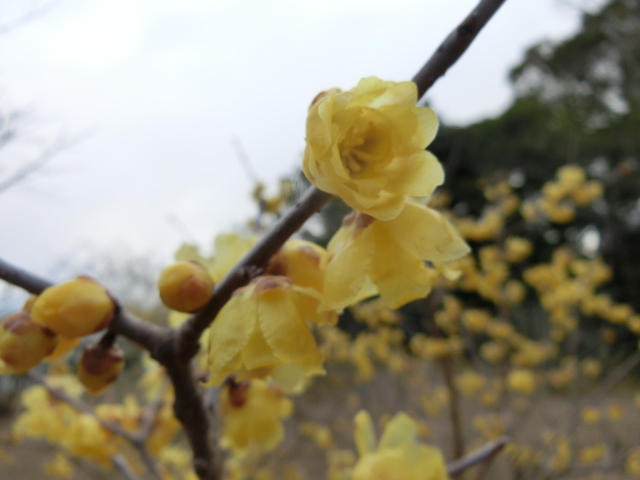 さらに梅園南側にあるソシンロウバイは見頃となっており、黄色の花を楽しむことができます。匂いも良いとされていますので、香りも含めてお楽しみください。