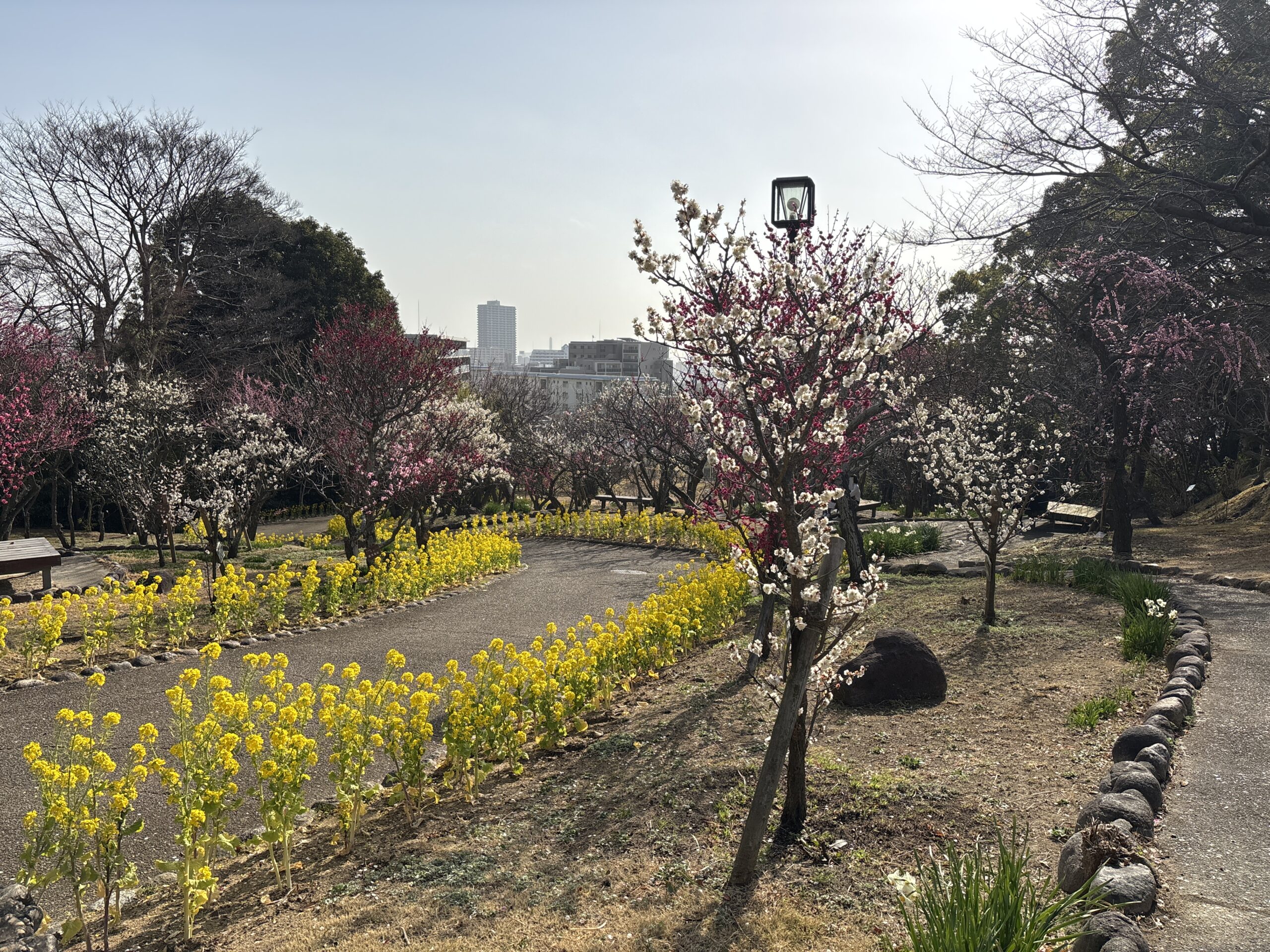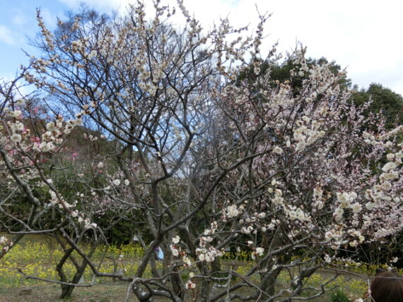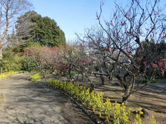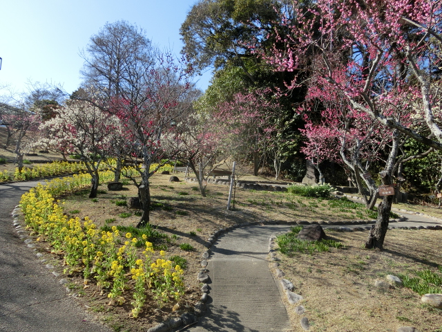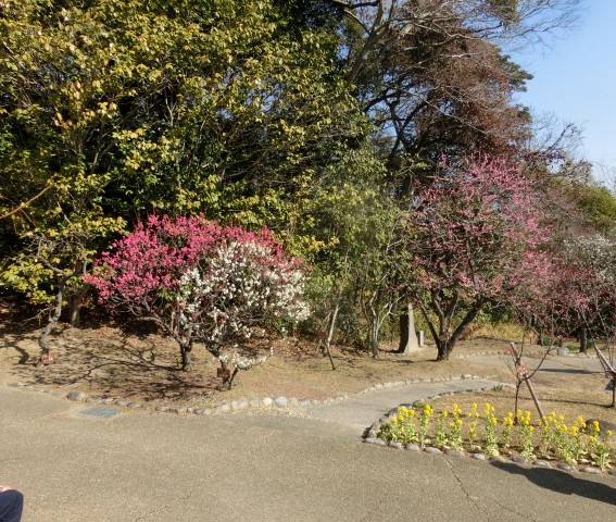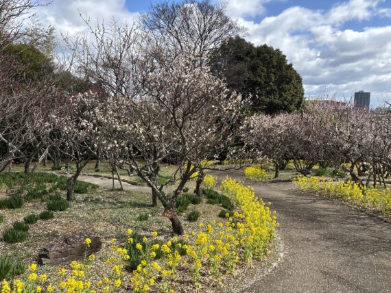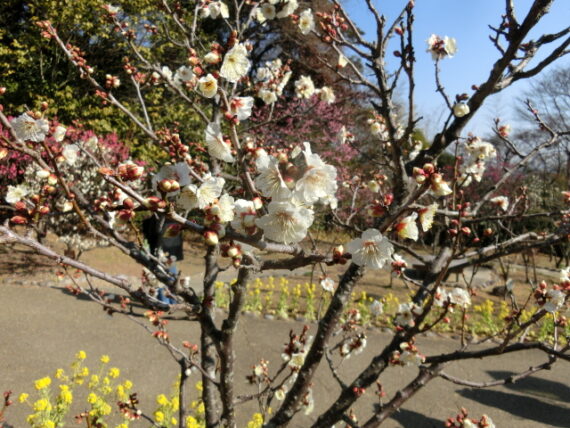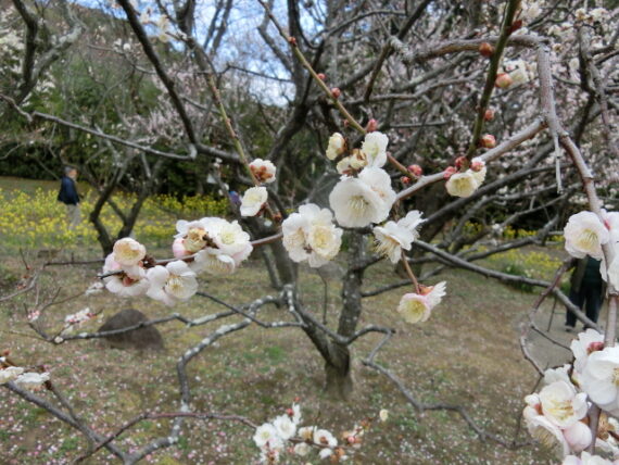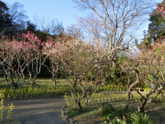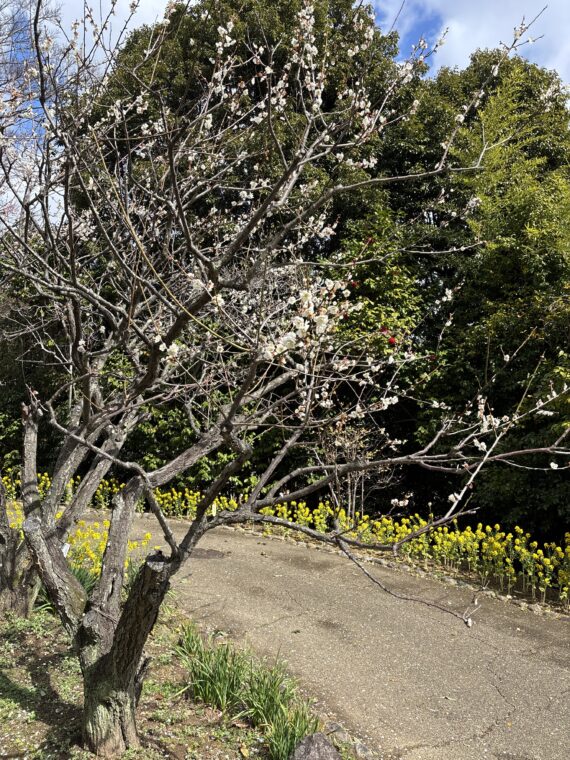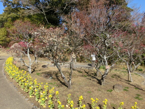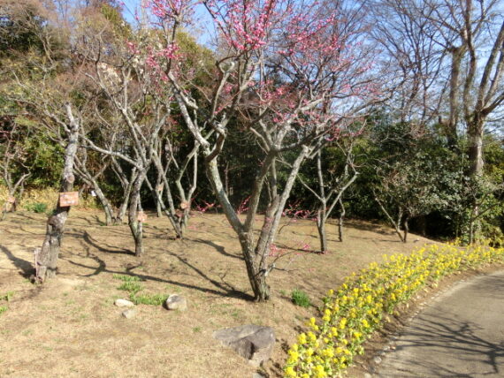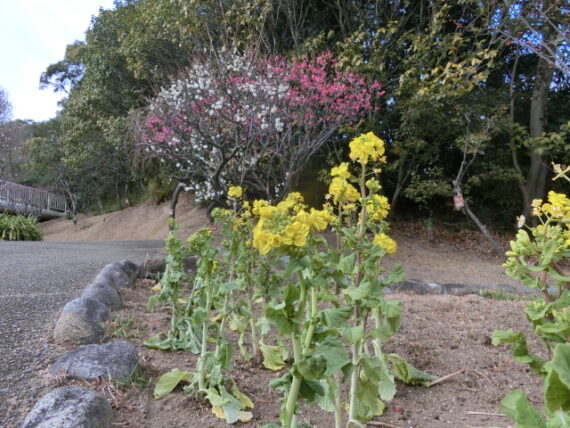 梅園全体ではまだまだ蕾が多い印象ですが、園路沿いにあるナノハナやニホンズイセンが綺麗に咲いておりますので、早咲きの梅と合わせてお楽しみください。