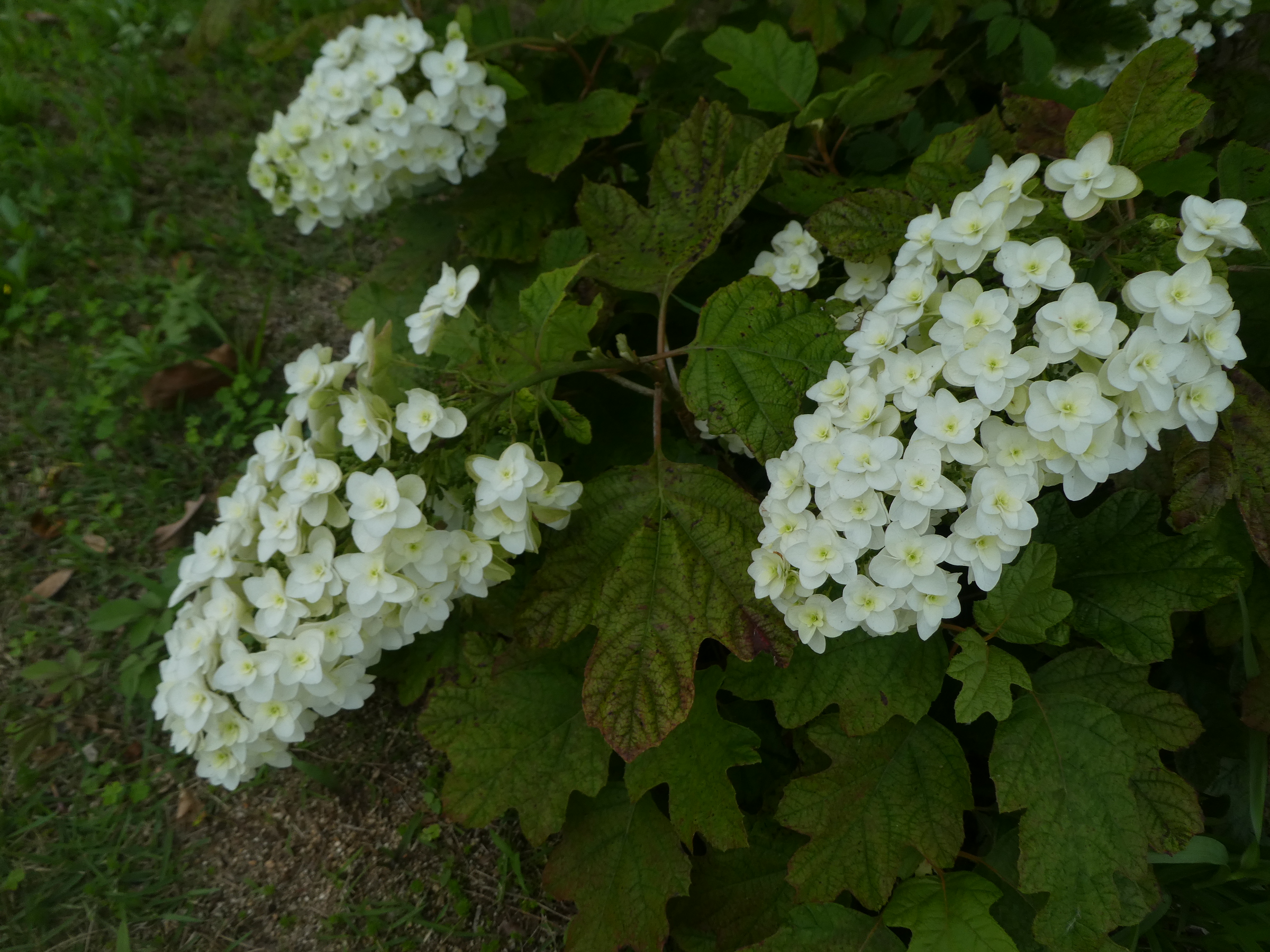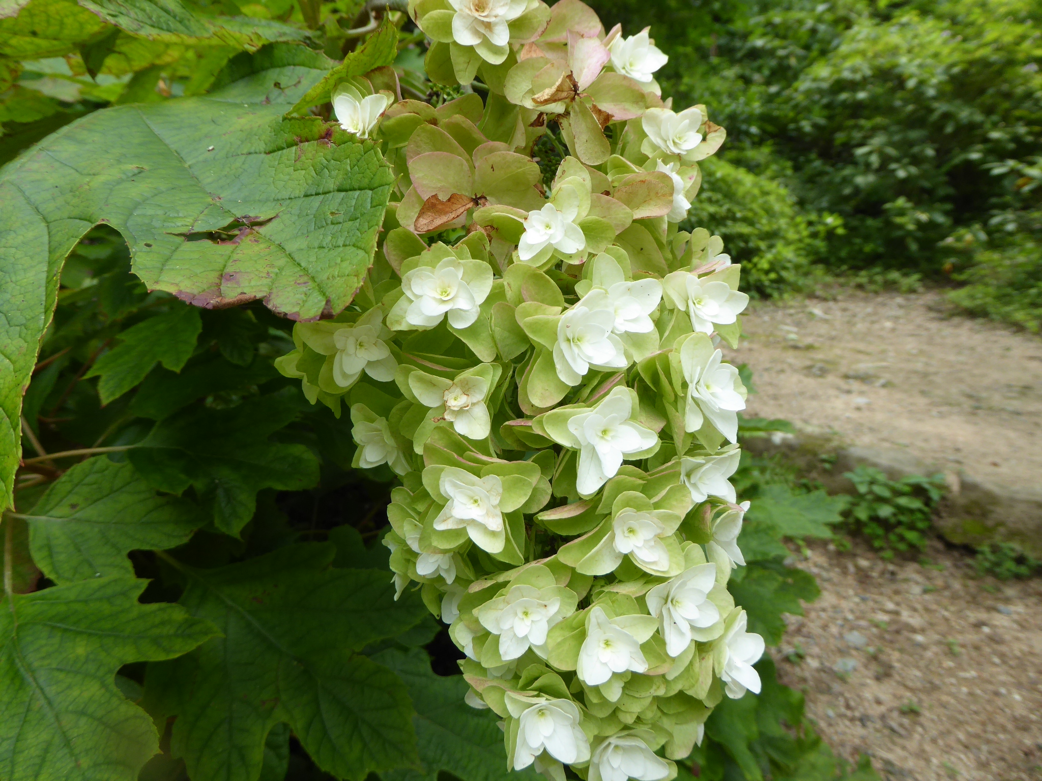 解説 カシワバアジサイの八重咲品種。花房の内部には多くの両性花がある。秋に赤く色づく事がある。