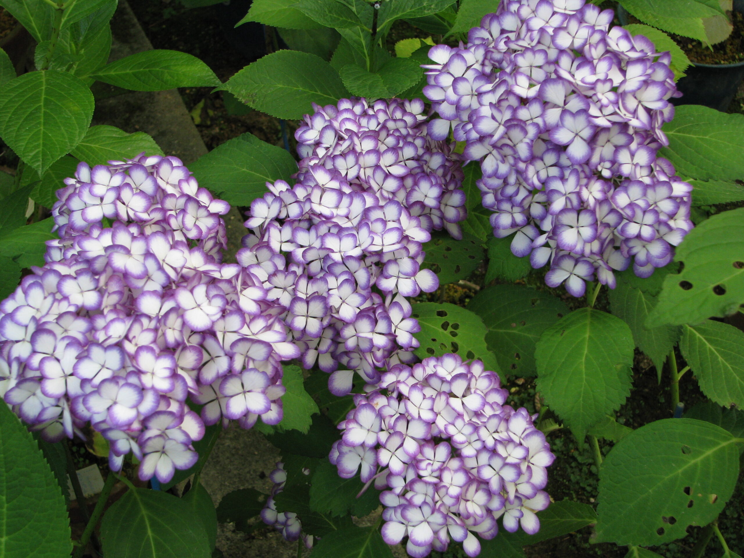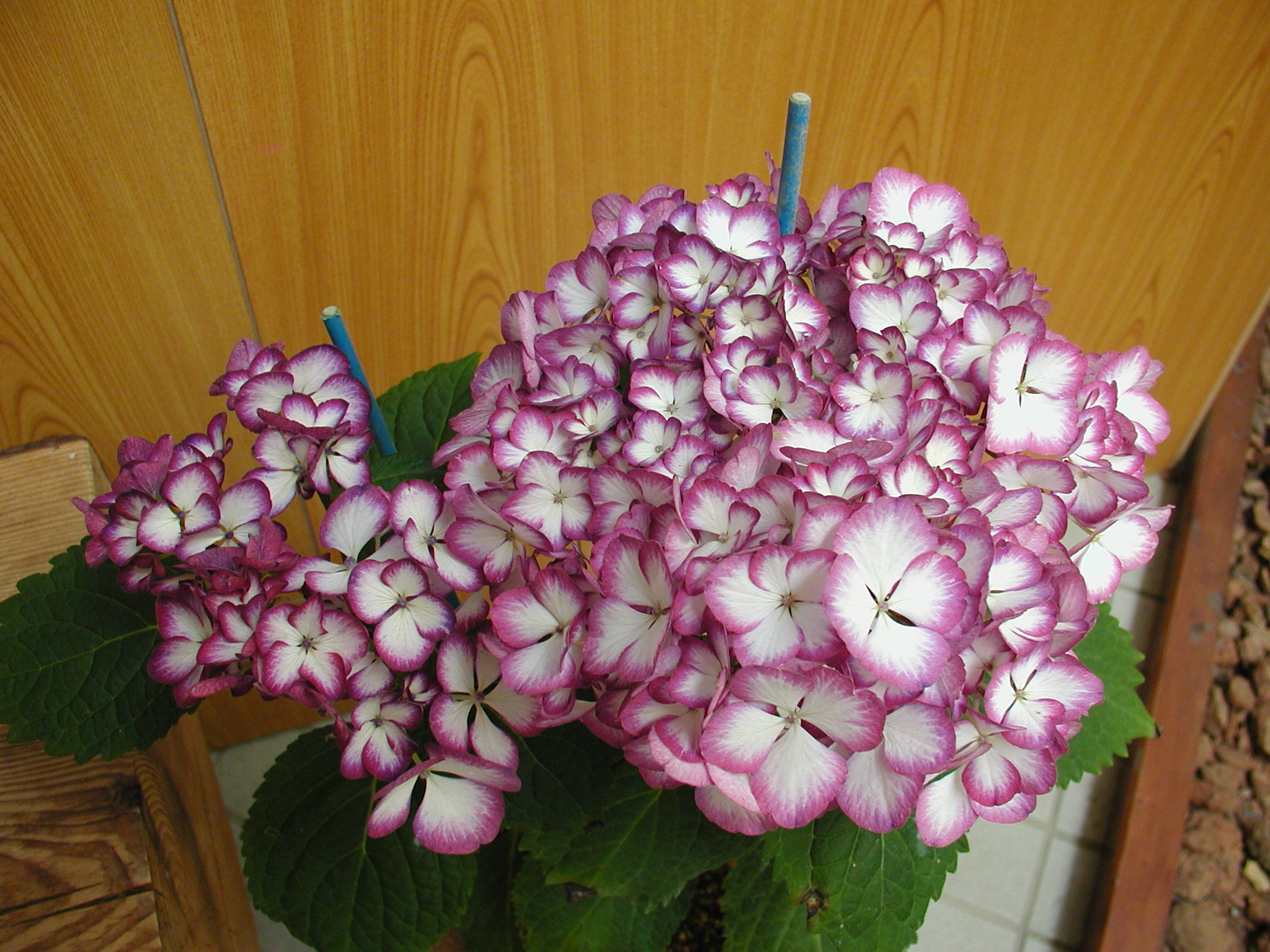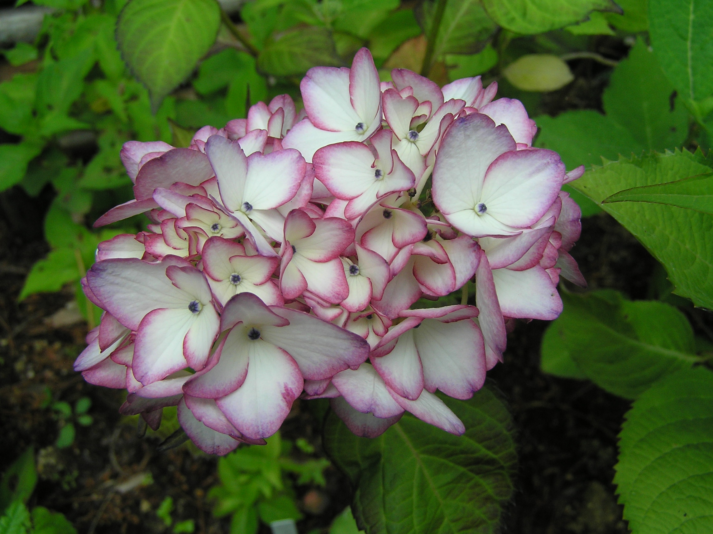 「キヨスミサワアジサイ(清澄沢紫陽花)」に由来する品種同士の交配種。薄い桃白色の装飾花に明るい紅色の覆輪が入る。