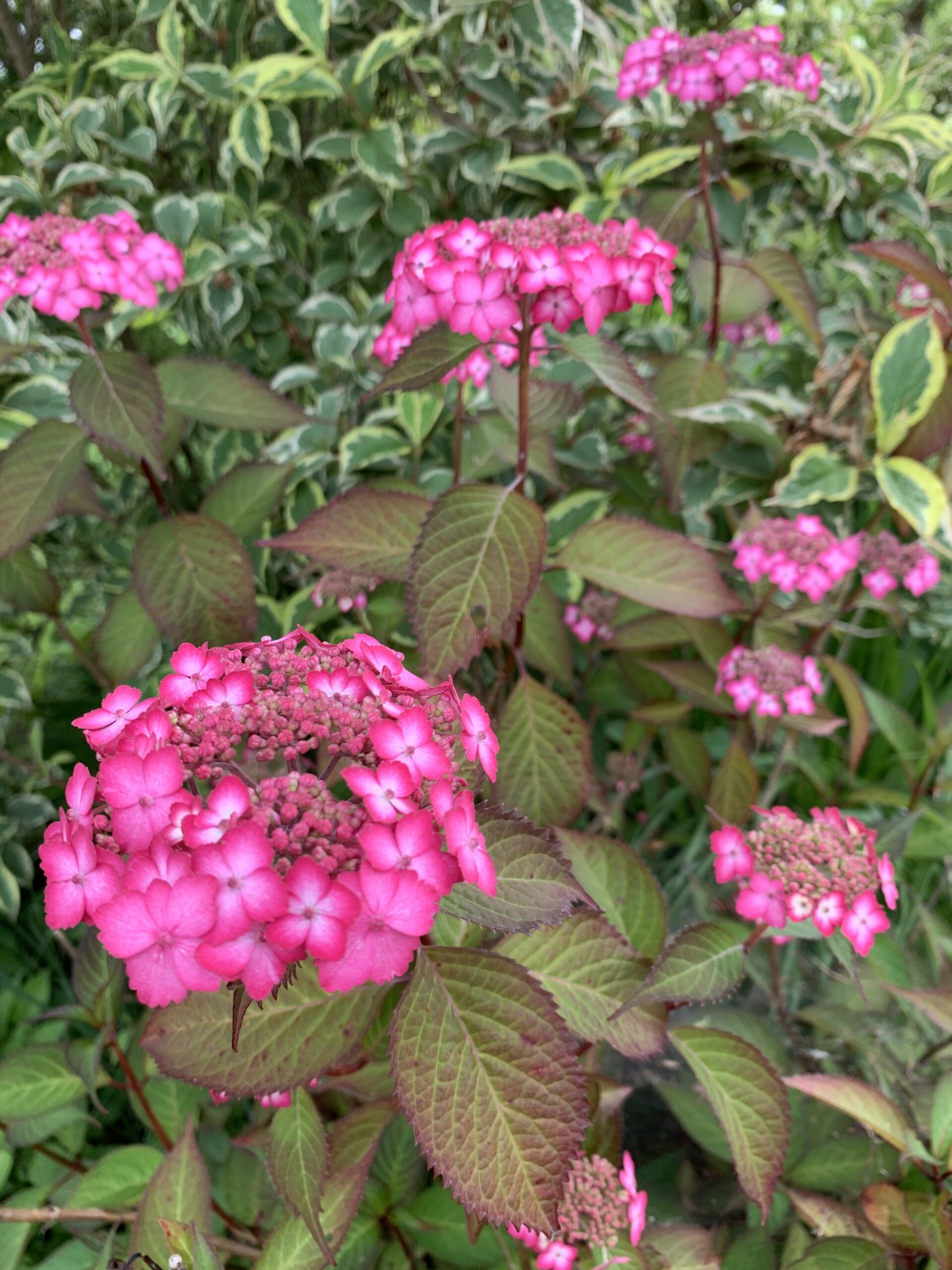 額縁咲~やや半八重咲き。 小輪で多花性で丈夫。ガーデンアジサイと言われ、他の植物と混植してもよい
