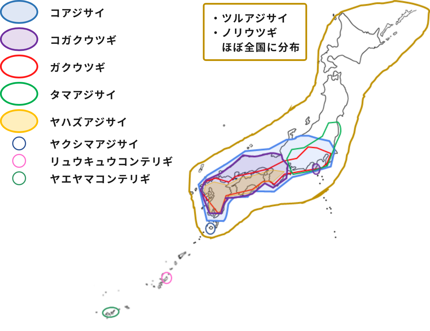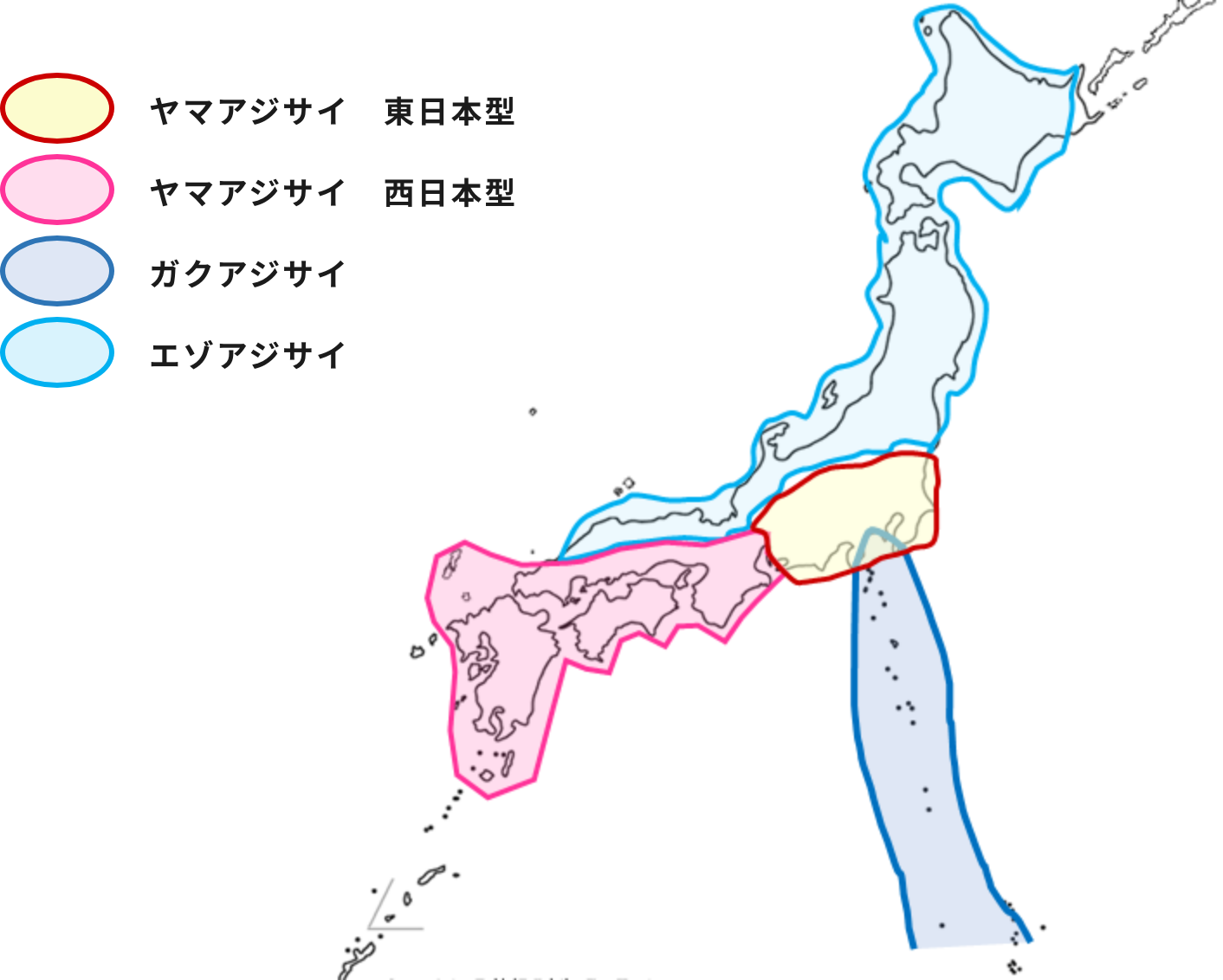 本州宮城県以南から四国・九州まで分布するが、西日本型と東日本型がありその境界は