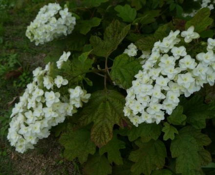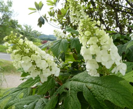 名前の通り、葉がカシワの葉の様に切れ込みがある。北米東南部原産で、穂状に咲き、写真左の一重のタイプは香りがある。写真右の八重咲は豪華で人気がある。日本のアジサイよりやや早く咲く。