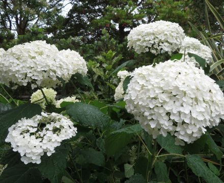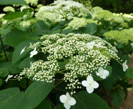 近年管理が容易で人気の高い白いアジサイはアメリカノリノキのテマリ咲きの品種のアナベル。原産は北米南東部で原種(写真左)は装飾花も小さくて少なく観賞価値は低い。