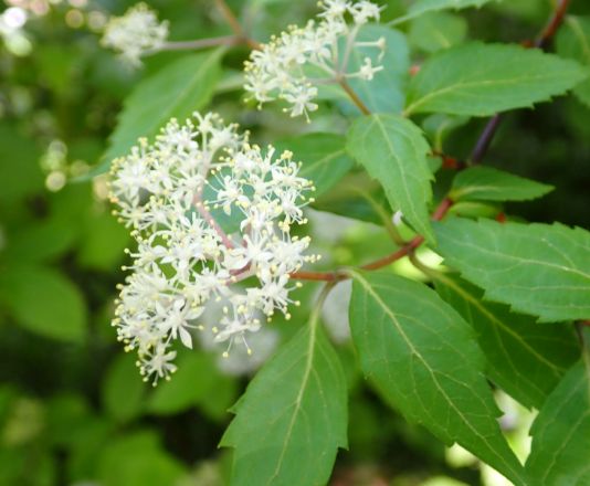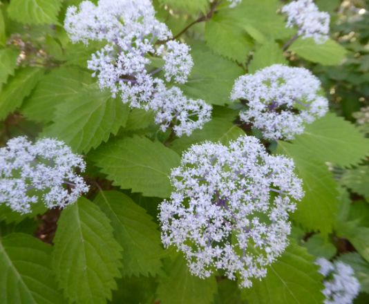 コガクウツギに続いて、少し青みがかった両性花のみのコアジサイがよく見られます。コアジサイは香りがよく、秋の黄葉も美しい低木です。