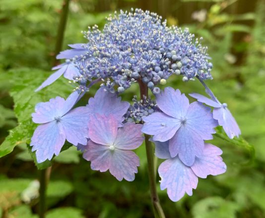 この両者は開花期が近く、自然の状態でも交雑種があり、それらをアマギコアジサイと呼んでいます。アマギコアジサイは装飾花を少し持つタイプもあります。