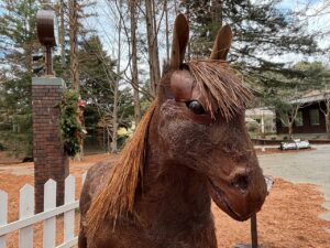 干支飾りの「午」は、職員が園内の樹林管理で発生した木々の枝や葉など「森の恵み」を材料にして、素材の特徴を活かしながら制作しました。今回の干支飾りはリョウブの枝や竹を使った馬。茶色いシュロの繊維が本物の馬の毛並みのようにリアル。長い松葉をいかして作った立派なたてがみがチャームポイントです。