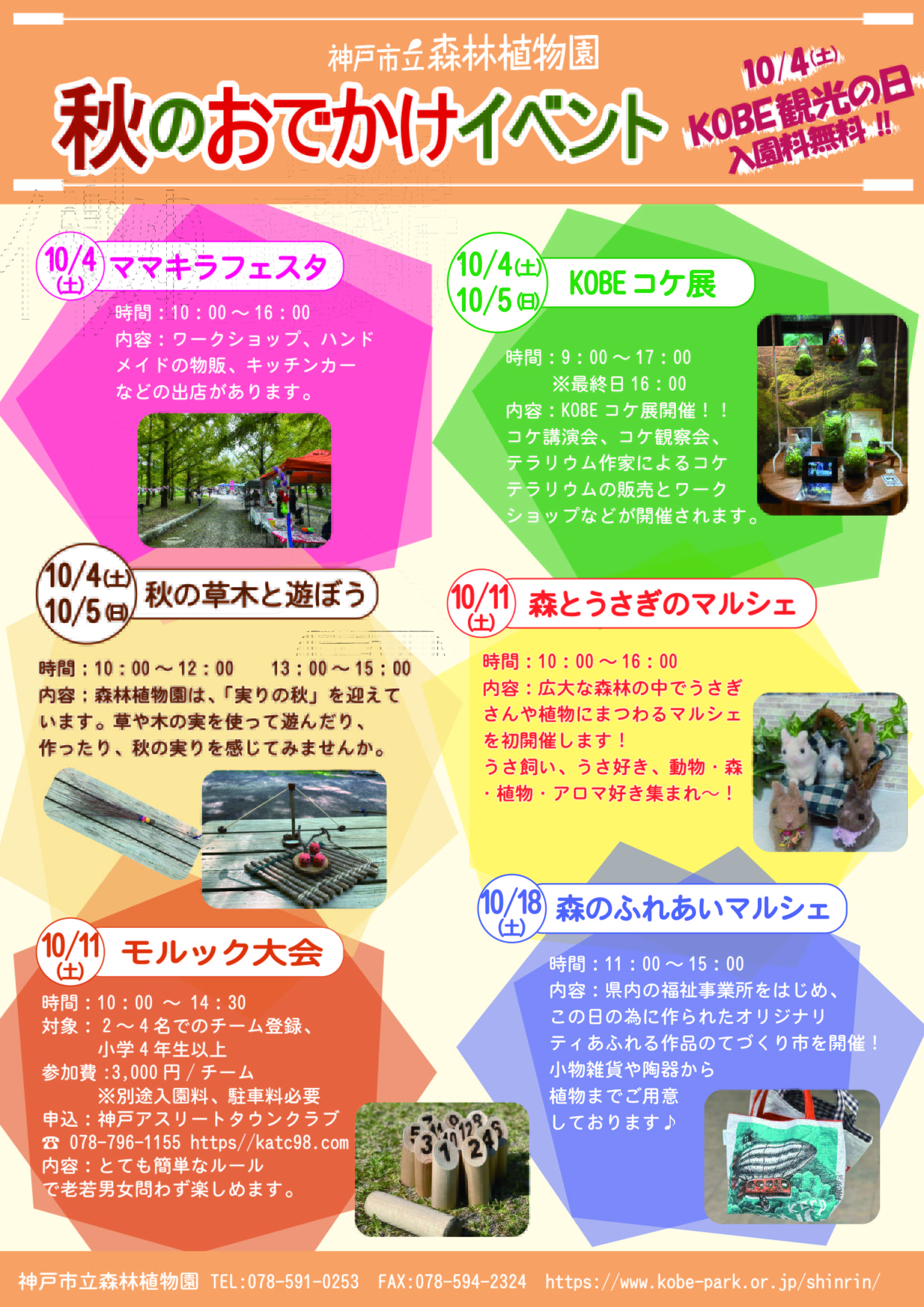 10/4(土)~10/19(日)の期間中に「ママキラフェスタ」、「森のふれあいMARCHÉ」、「森とうさぎのMARCHÉ」、「KOBEコケ展」、「秋の草木と遊ぼう」をはじめ大人の方から子どもさんも楽しめるプログラムが盛りだくさん!!