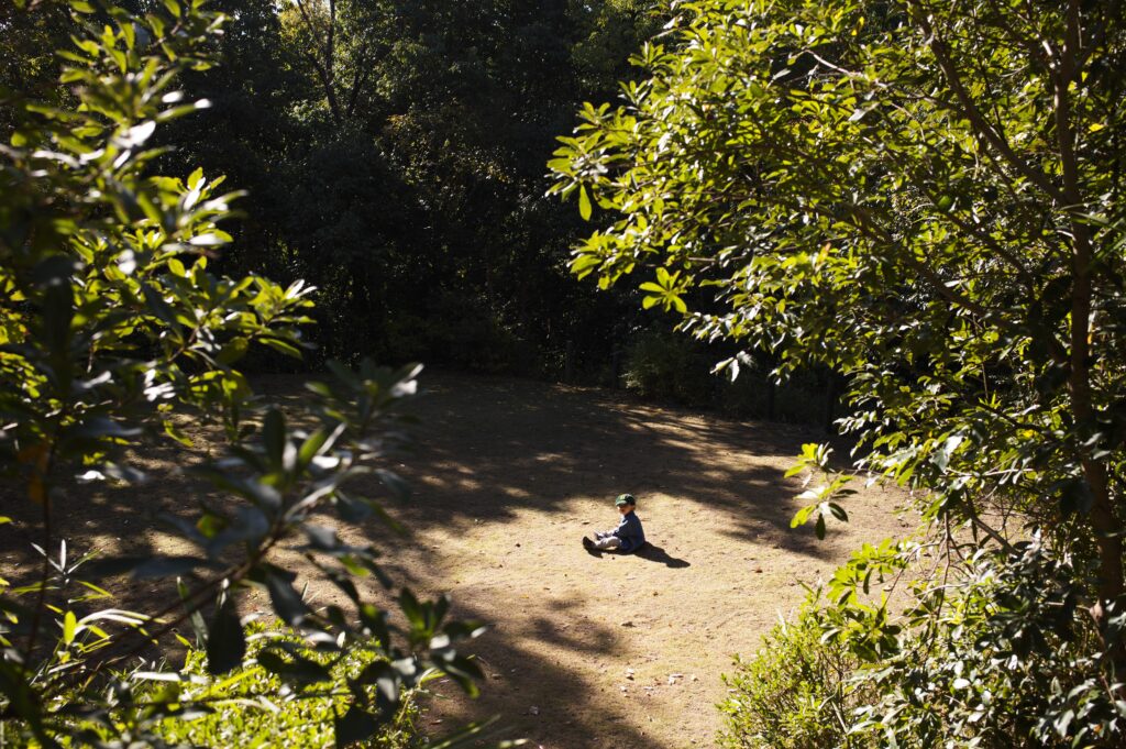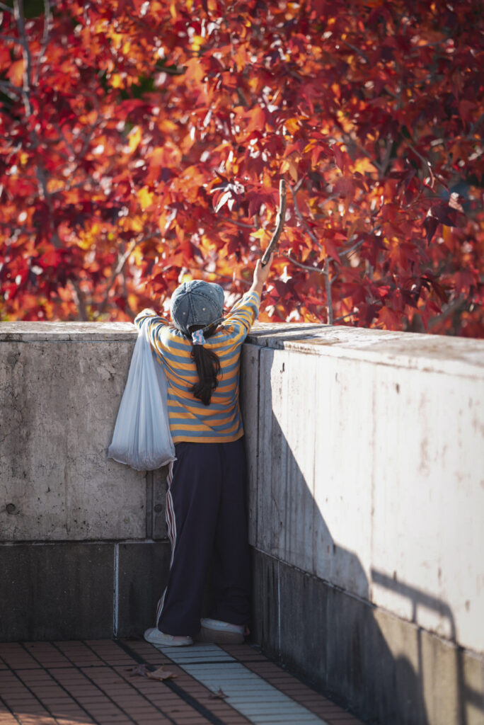 画面上部いっぱいに切り取られた紅葉に向けて小さな女の子が木の枝を掴んで手を伸ばしています。よく見ると左手にぶら下がっている大きめのビニール袋には、たくさんのどんぐりが入っており、「秋」に貪欲な姿勢が伺えます。もしかするとタイトルの『秋、みーつけた』は女の子が見つけた紅葉ではなく、貪欲な女の子そのものが「秋」であり、撮影者がそれを見つけているのかもしれません。手に持つ木の枝は、まるで餌をあげるように紅葉に捧げているようにも見えてくる不思議な写真です。