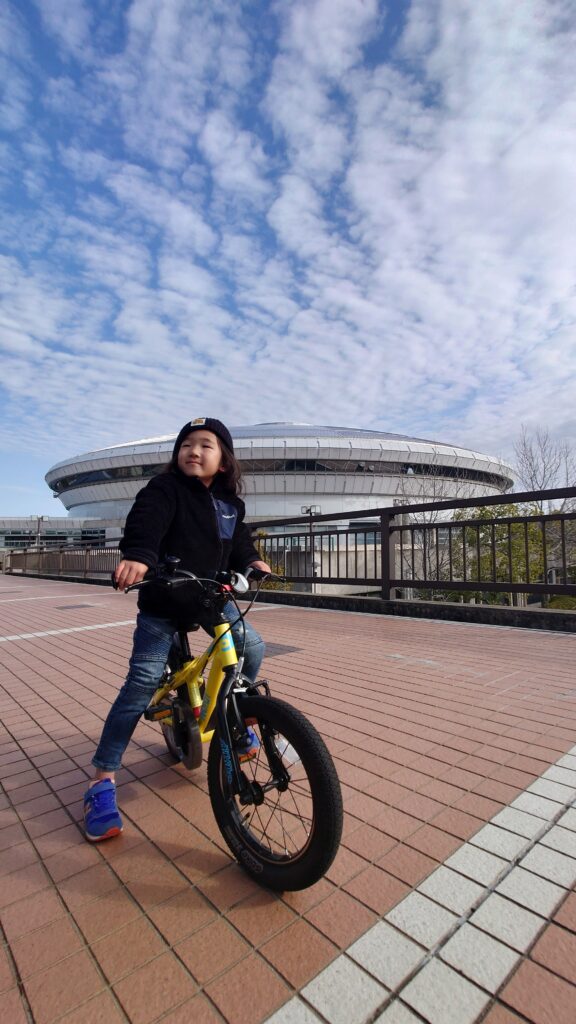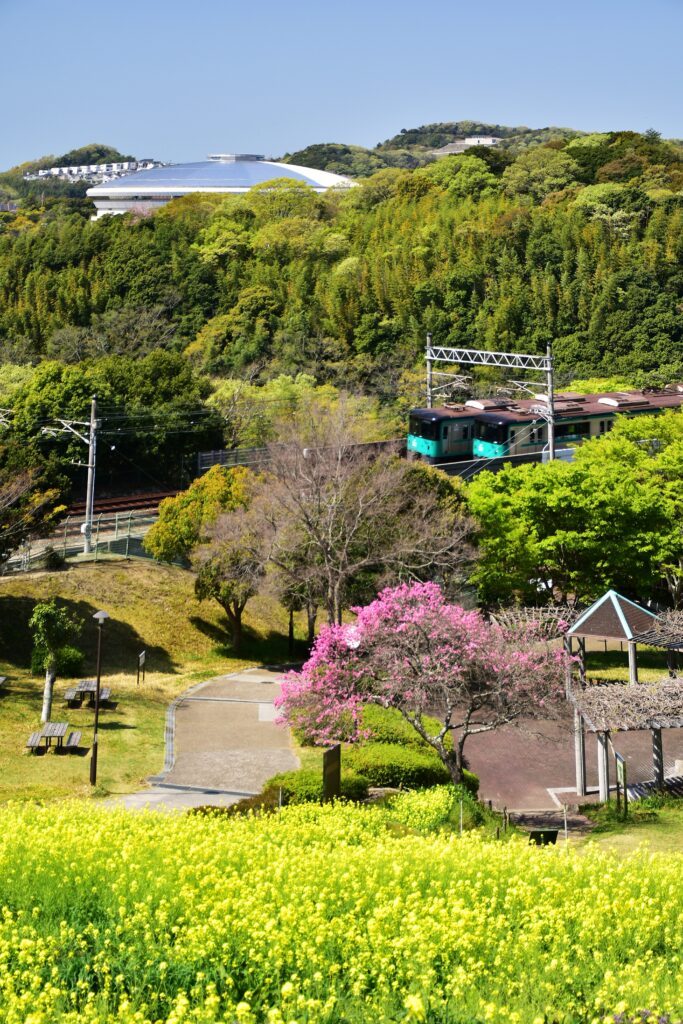 上下線の地下鉄車両、春に咲く菜の花、そしてグリーンアリーナ神戸が絶妙に画面に収められ、当園ならではの風景が鮮やかに表現されています。キクモモの桃色が華やかさを添え、視覚的な楽しさを感じられます。春の息吹とともに活気ある雰囲気を感じさせる、印象深い一枚です。