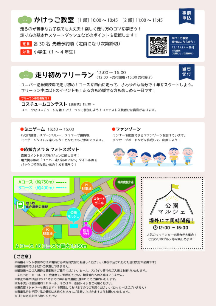 自分のペースで好きな距離を走れる「フリーラン」や、「かけっこ教室」「ミニゲーム」「ファンゾーン」「応援カメラ&フォトスポット」など、様々なプログラムを実施します。